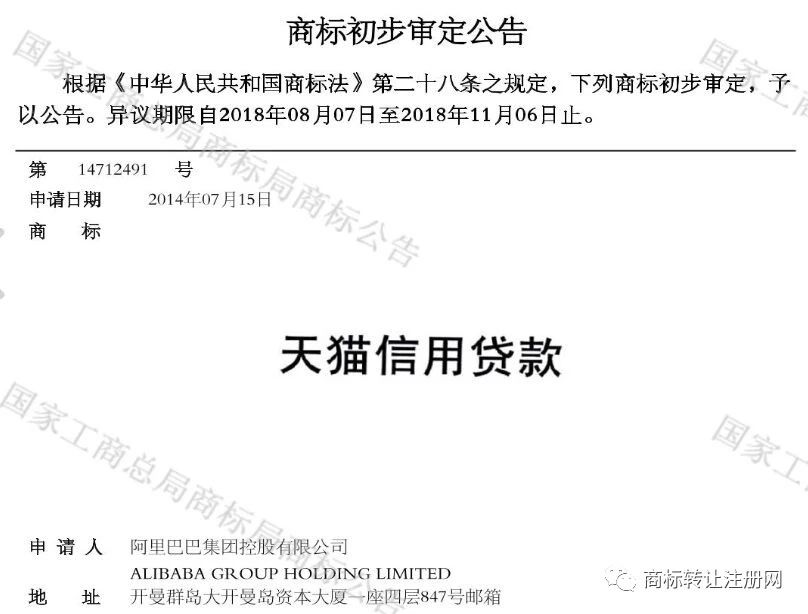 天猫信用贷款与天猫分期其实14年就开始申请了,可是到现在还没拿证,才进入公告阶段,所以这里也有个启示,就是商标注册的周期一般比较长,如果急着用商标的话,买个商标比较划算,分分钟就有商标权。