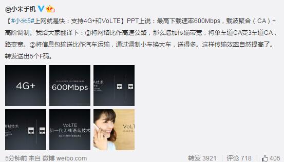 【#小米5#上网就是快:支持4G+和VoLTE】PPT上说:最高下载速率600Mbps,载波聚合(CA)+ 高阶调制。我给大家翻译下:①将网络比作高速公路,那么增加传输带宽,将单车道CA变3车道CA,路变宽。②将信息包输送比作汽车运输,通过调制小车换大车,送得多。这样传输效率自然提高了。转发送出5个F码。