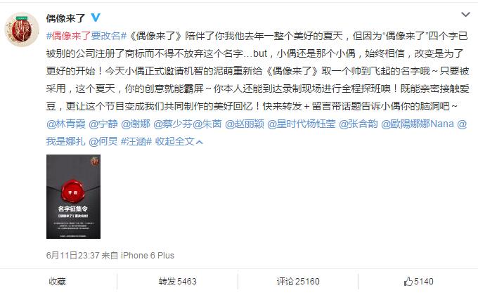 但是现在偶像来了却想改名,原因是什么呢,这个在偶像来了的官方微博中有说明: