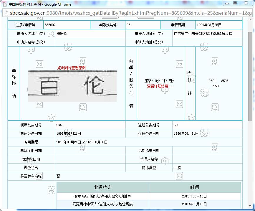 其实在中国,最早的百伦商标是1994年8月25日,地址为广东潮阳市峡山金光路278号的潮阳市工商经济发展总公司鞋帽公司申请的,注册号为865609。后来才转让给周乐伦。这个可以在中国商标网上查询到结果: