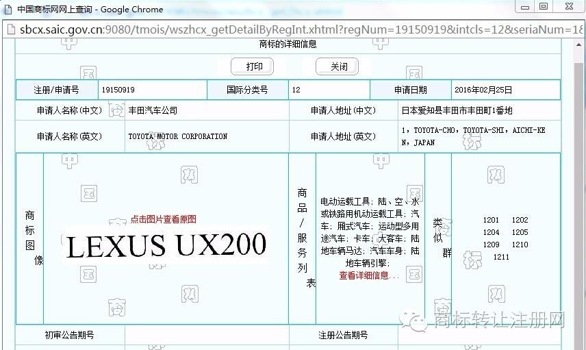 今天这里分析一下丰田的LEXUS UX200商标,这个商标,在中国商标局是可以查询到的: