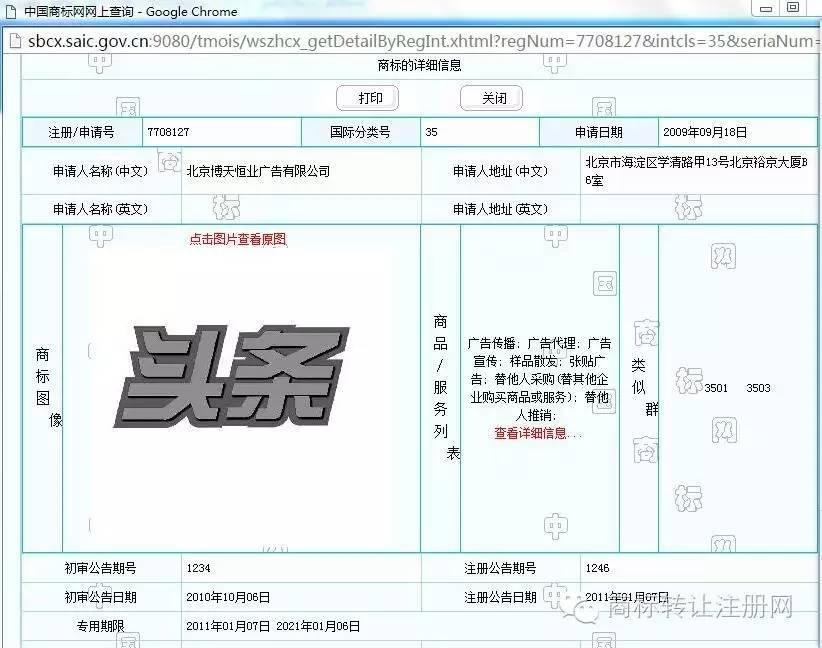 这个案件的一个关注点就在于商标的分类,没错,今日头条是注册了不少商标,包括第9类,第11类,第42类等等方面的今日头条商标,但是35类的广告项目中,头条这个商标的持有人是北京博天恒业广告有限公司。这一点,大家知道百度有广告,可人家也注册了广告类商标,搜狐有广告,也有广告类商标。也就是说,人家对商标进行了多类保护。
