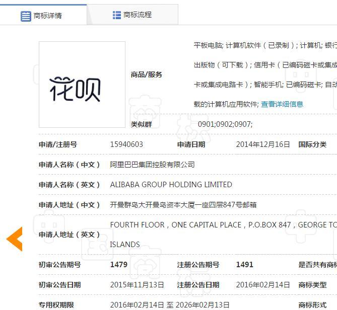 从这里可以看到,花呗这个第9类商标,确实名归于马云的阿里巴巴。